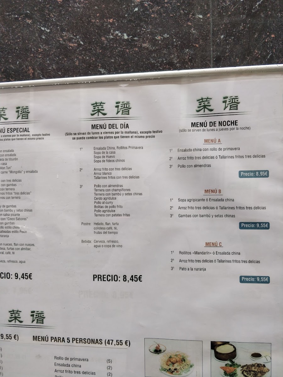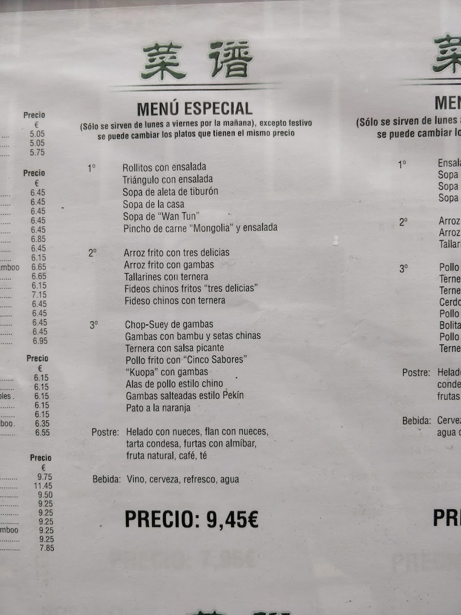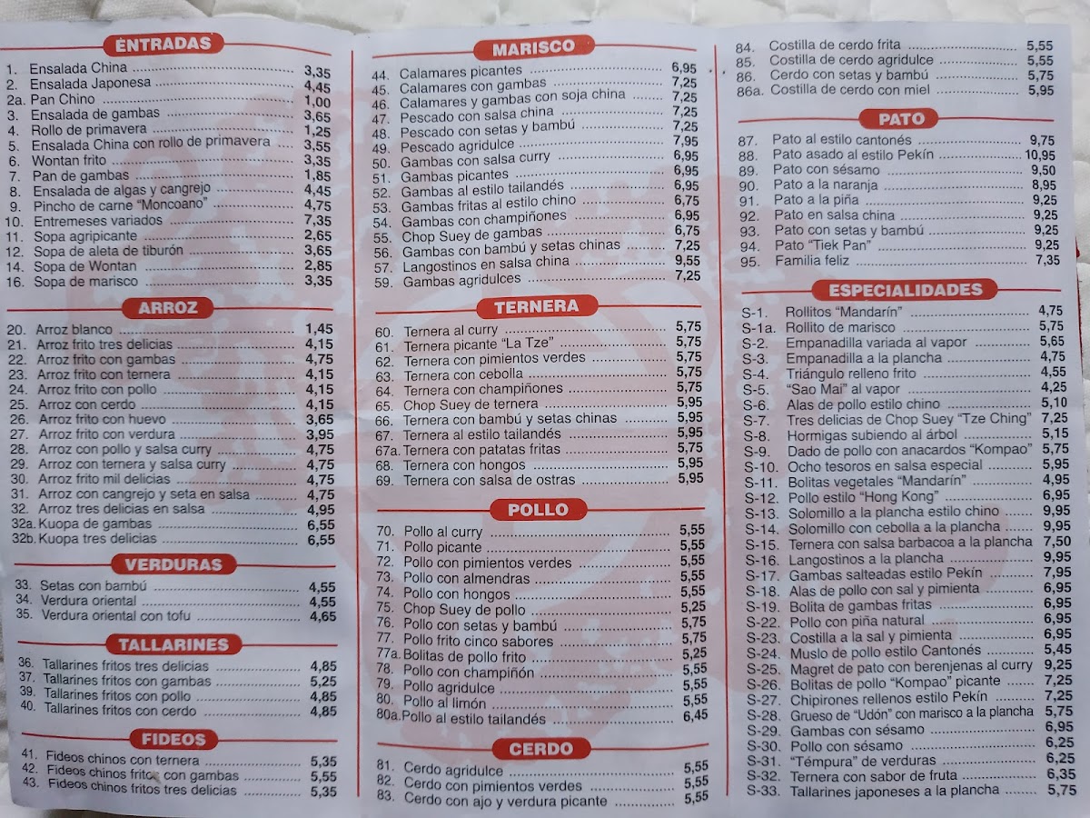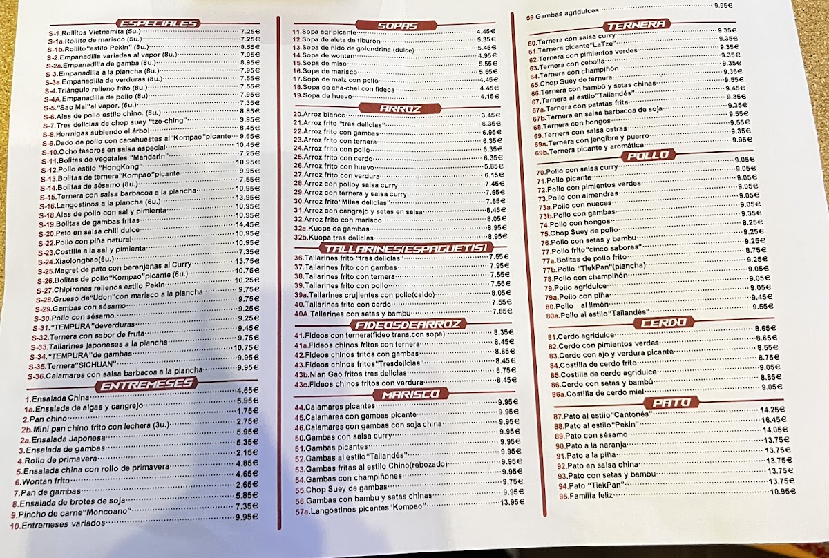 2 En salada china ,8 rollitos primavera, 3 arroz tres delicias, 1 pollo picante, 1 chop suey de gambas, 1 ternera a plancha y bolita de pollo frito, pato estilo Pekín, costilla a la sal y pimienta, ocho tesoros en salsa especial
