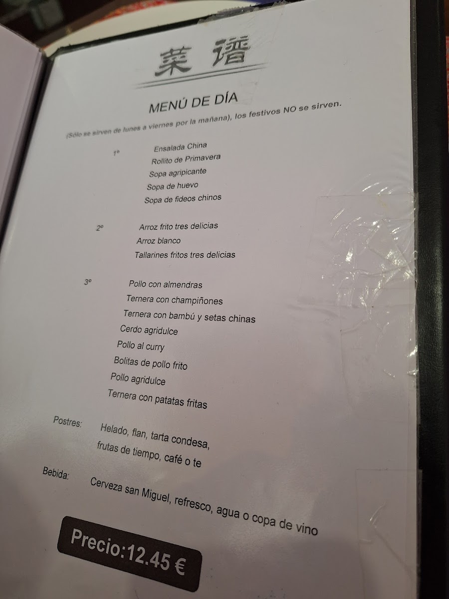 3 rollos de primavera 1 ensalada china 1 arroz tres delicias 1 gambas con setas y bambú 1 ternera con salsa picante 1 bolita de pollo frito